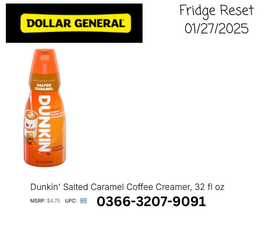 - Dunkin’ Donut Creamer Salted Caramel 32oz – UPC: 0366-3207-9091