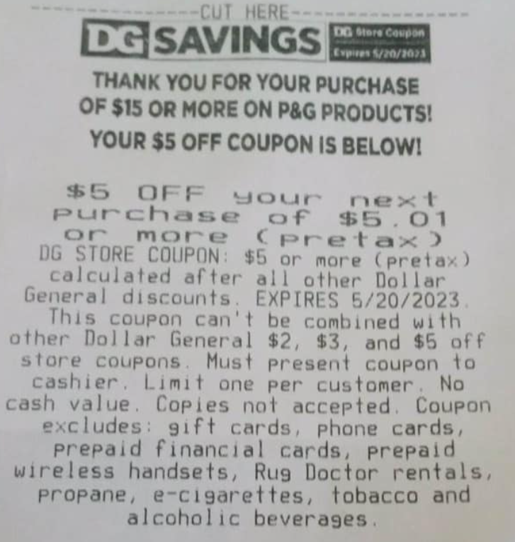 Get a $5.00 coupon printed on the bottom of your receipt like this when you physically spend $15.00 on select P&G products. This means you have to spend $15.00 after all coupons and promotions. This coupon can be used on $5.01+ of items on your NEXT transaction. The $5.01 coupon cannot be combined with any other dollar off DG Coupon like the $5/$25 or the $5/$30.