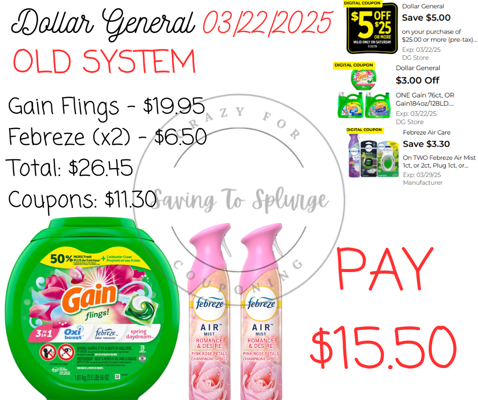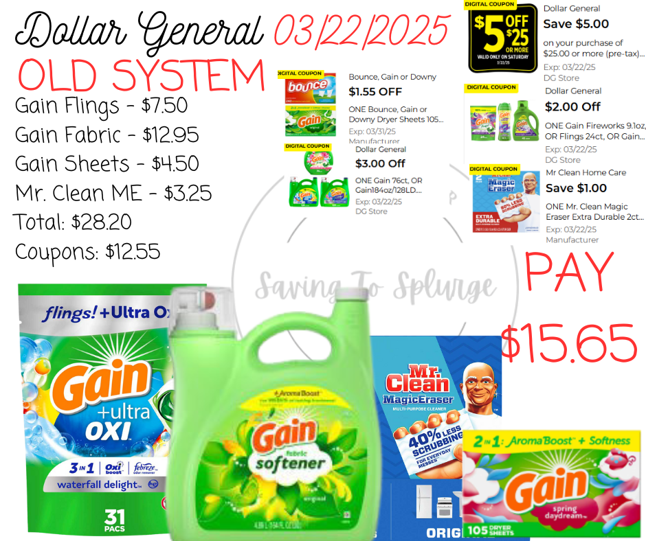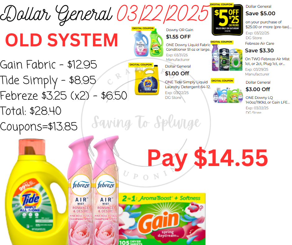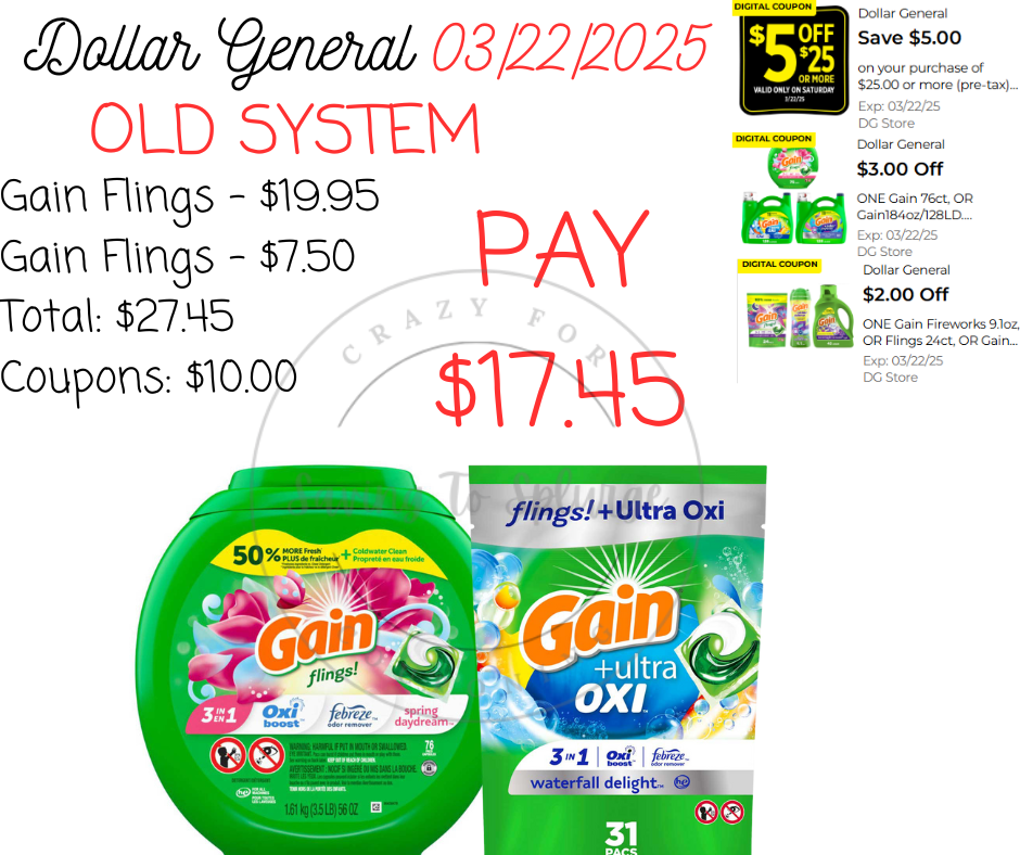 ✅ What Will and Won’t Stack? ✔️ $5/$25 WILL STACK at both old and new system stores. No paper coupon is needed. ✔️ $5/$25 stacks with Tide & Gain store coupons (as long as you meet the new system threshold requirements). ❌ $5/$30 Gain WILL NOT STACK with other Gain store coupons like $1.50 off Gain Detergent (since they are both Dollar General store coupons). ✔️ $5/$30 Gain WILL STACK with manufacturer coupons on Gain-scented products (Swiffer, Febreze, Mr. Clean, etc.) at both old and new system stores.