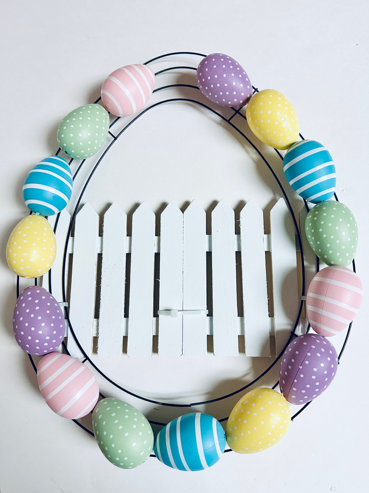 Add the piece of cardstock or cardboard on the bottom of the fence pieces and then stick it into the bottom of the wreath form with hot glue.