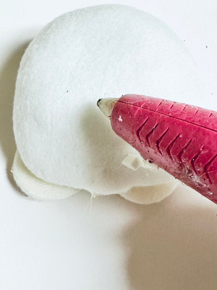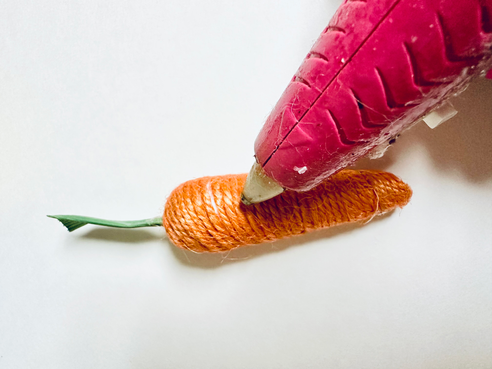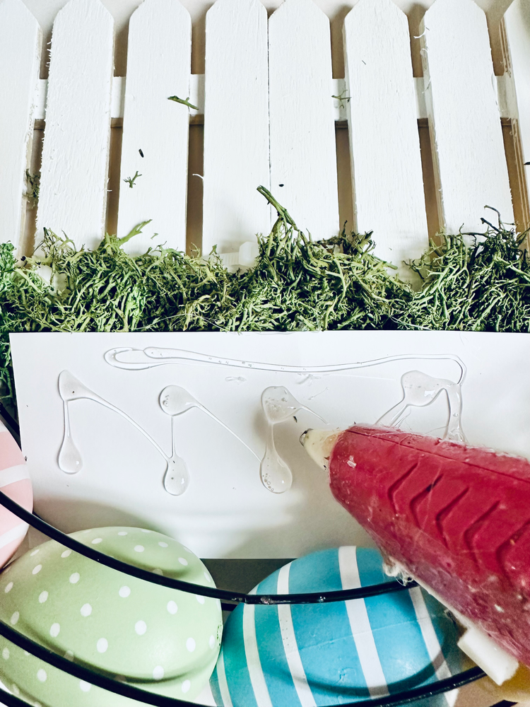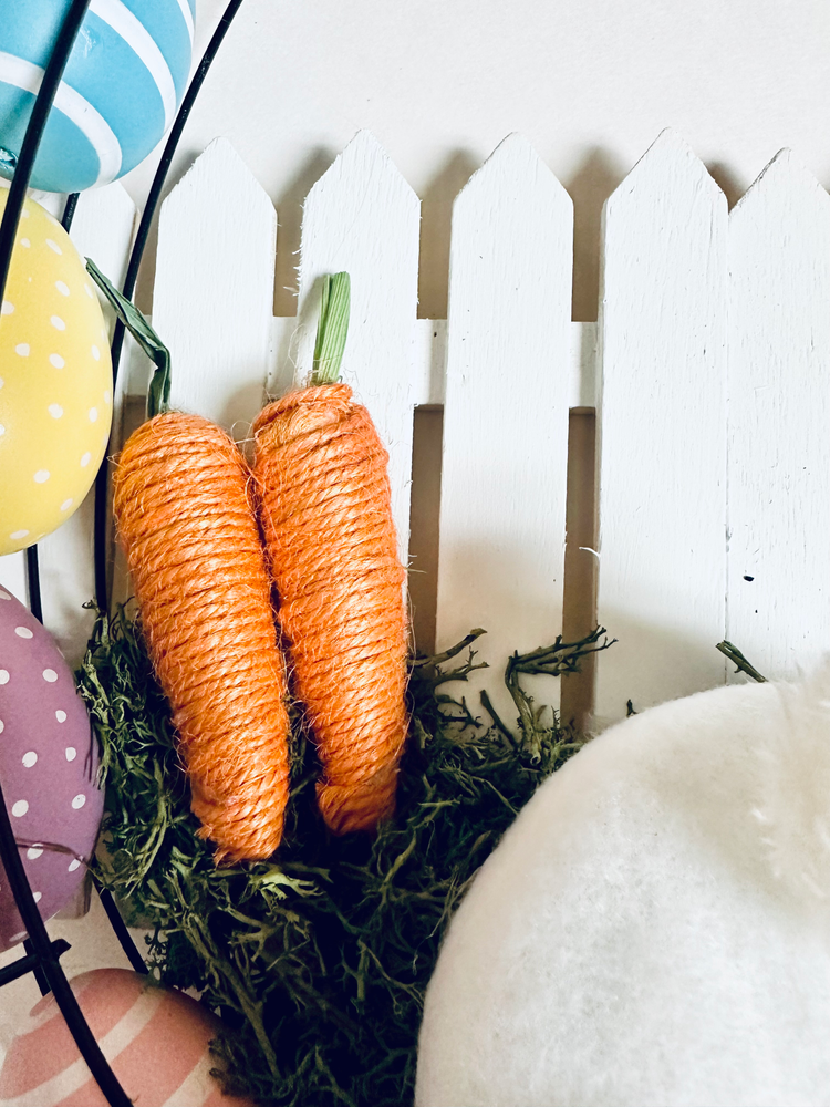 Add some hot glue to the backside of the bunny butt and press firmly onto the moss. Then add glue to the twine carrots and add those to the fence sectio