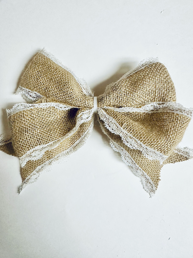 I made a simple bow using the burlap ribbon and securing them with a zip tie. Add some hot glue to the backside of the bow and press firmly onto the top of the wreath form.