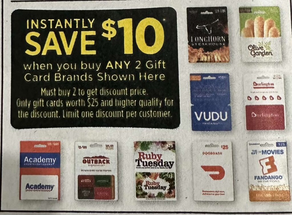 Save $10 instantly on a variety of dining and entertainment gift cards. These options are excellent for holiday gatherings, family outings, or just enjoying a night out. Here’s the full list of gift cards eligible for the $10 instant savings:
