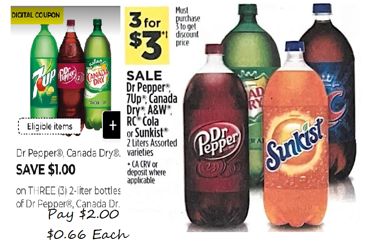 Dollar General will be having a three day sale 06/29-07/01. Dr. Pepper, Canada Dry, A&W, & 7Up 2 Liter bottles will be on sale 3 for $3.00 with a $1.00 off 3 digital coupon. This coupon can be found in your Dollar General app.