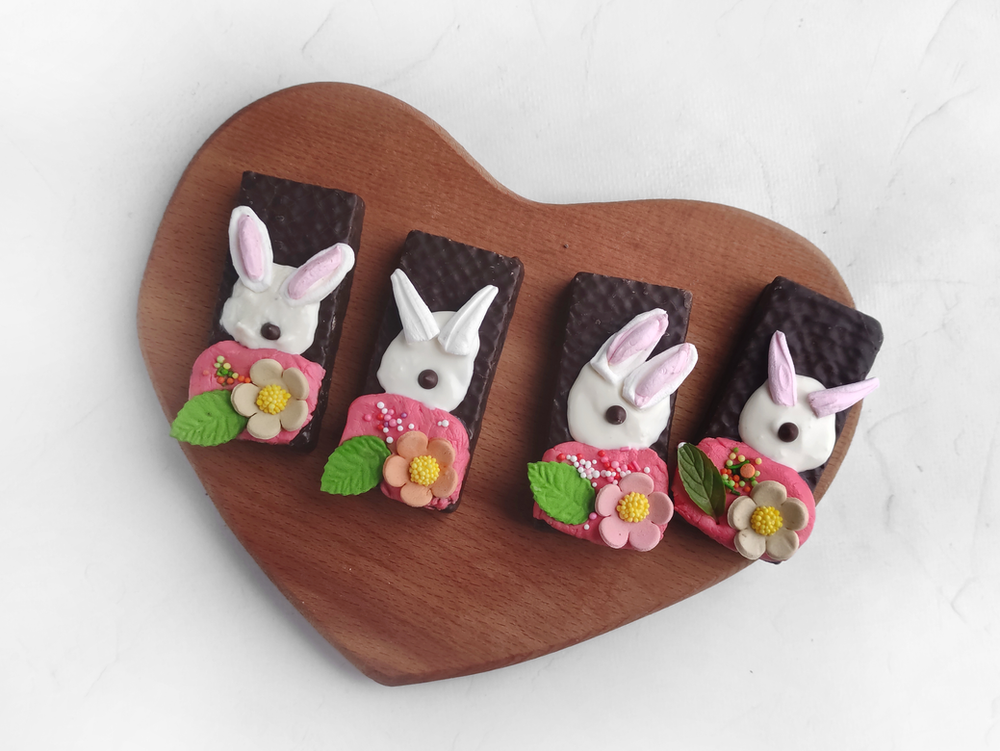 4. Melt the remaining chocolate. Scoop 1/3 tsp. chocolate and shape into a bunny face. Place the ears on the hot chocolate and place the spout. Chill the bars in the refrigerator for 20 minutes and color the faces with a pastry marker. Try to give them different moods to make the bunnies a little different from each other.