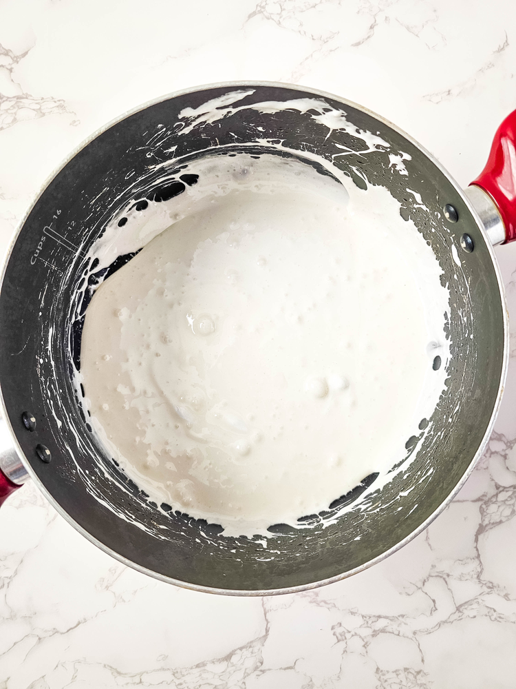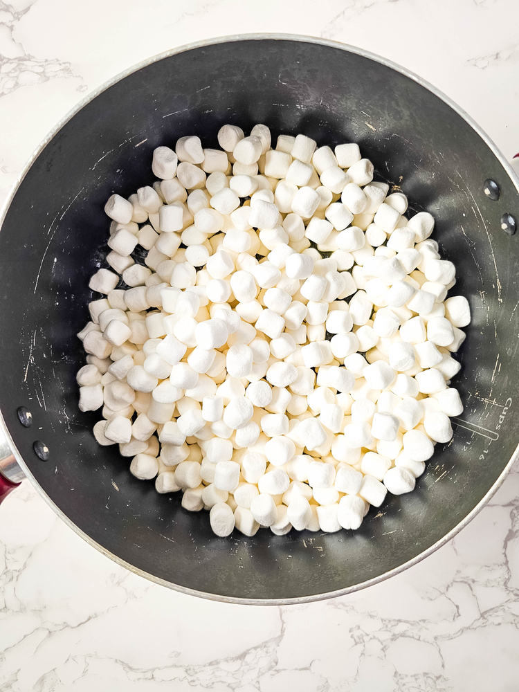 Once the butter is melted, add the marshmallows, and stir often, until completely melted.