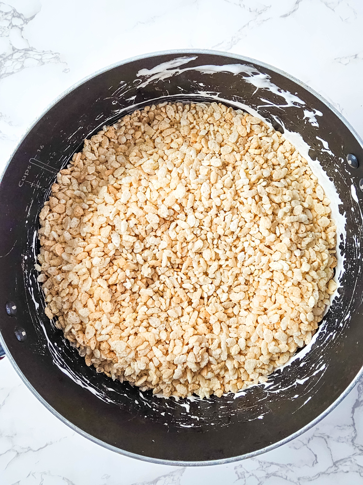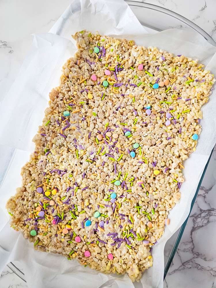 Add the Rice Krispies and sprinkles, stir well to completely combine.