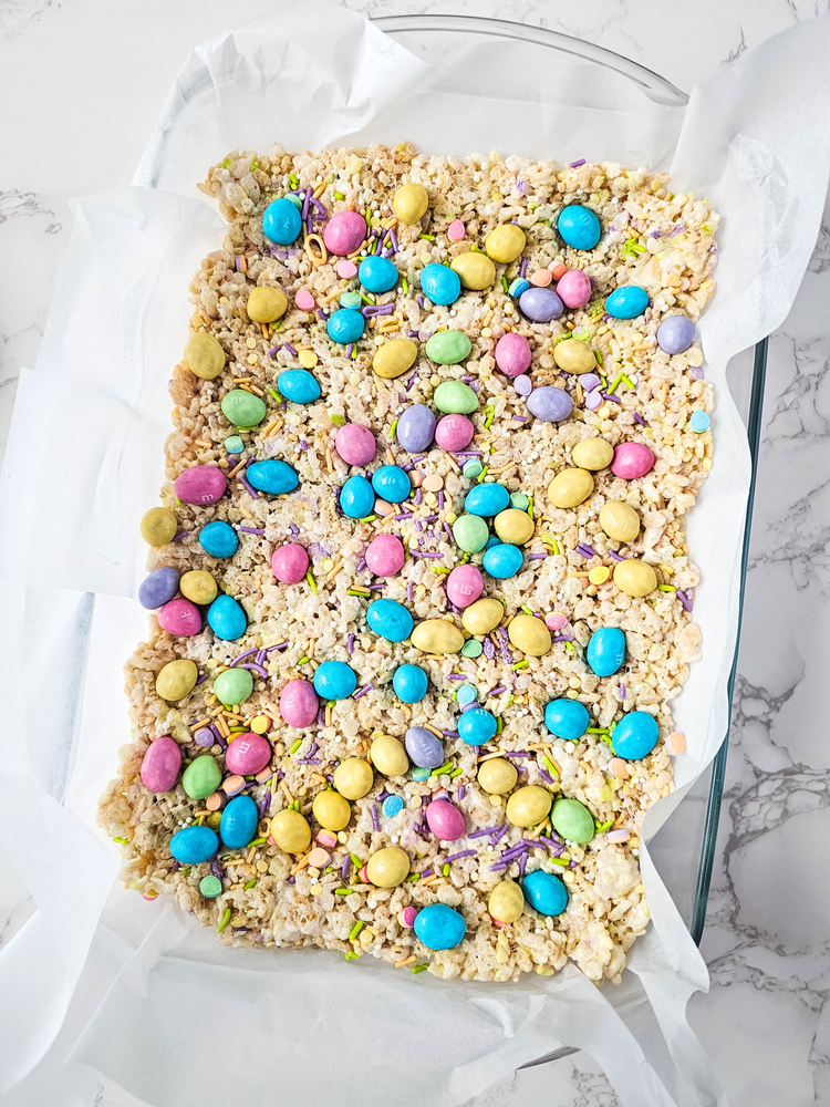 A classic Rice Krispies Treats recipe, with Easter sprinkles mixed in, and topped with pastel M&Ms make a perfect treat for the holiday!