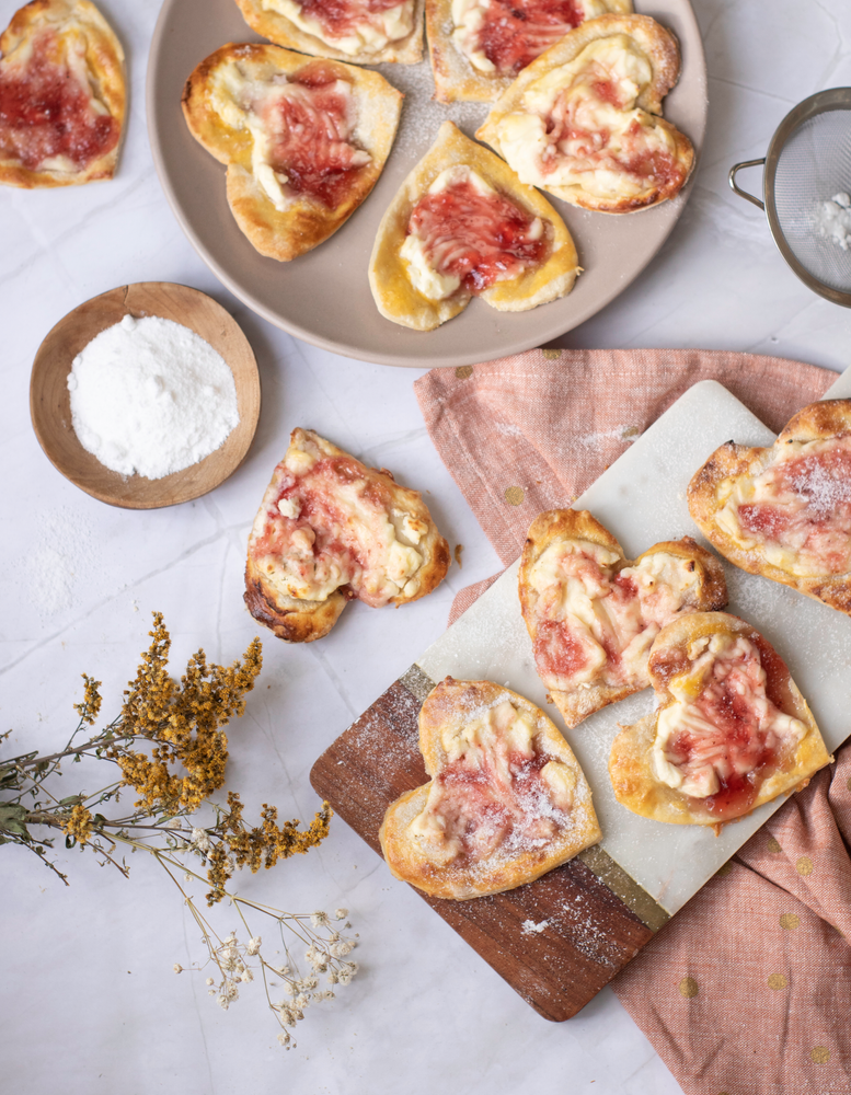 · Spoon a dollop of raspberry or strawberry jam on top of the cream cheese filling on each pastry heart. Optionally swirl the jam with a toothpick or the back of a spoon to create a marble effect.