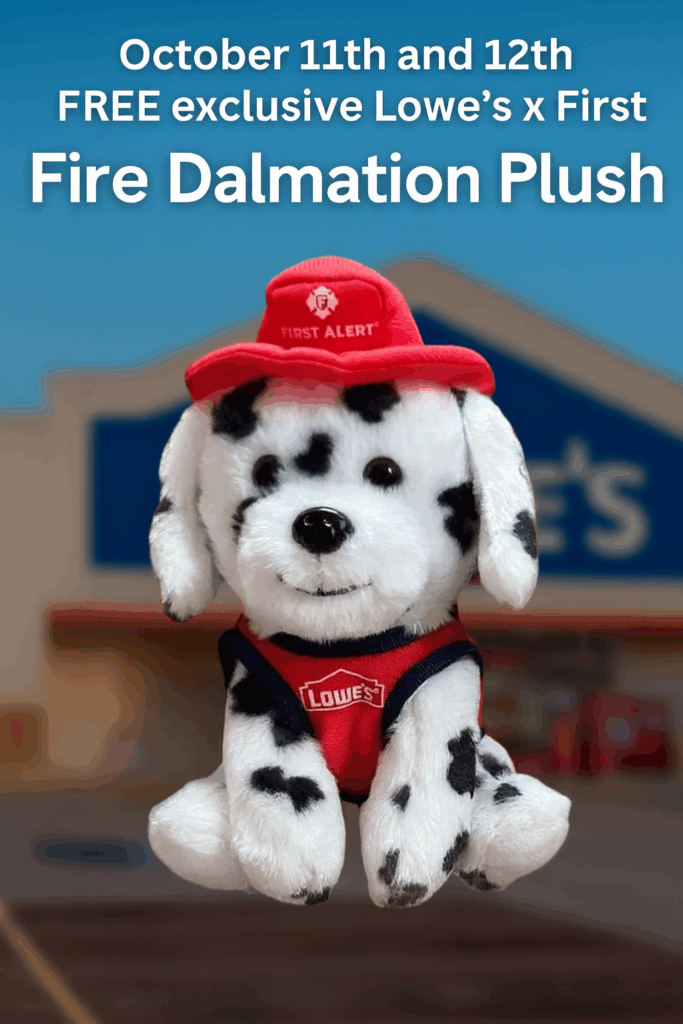 Calling all parents, families, and collectors! 🎉 On October 11th and 12th, starting at 10 AM each day, Lowe’s Rewards Members can snag a FREE exclusive Lowe’s x First Alert Fire Dalmatian Plush. This adorable plush pup, dressed in a firefighter’s hat and Lowe’s vest, is the perfect way to celebrate Fire Safety Month.