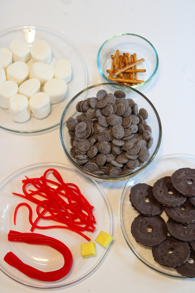 1. Gather marshmallows, cookies, pretzels and melting chocolates.