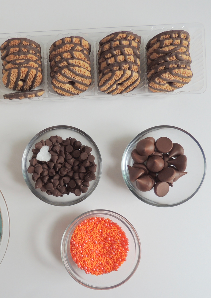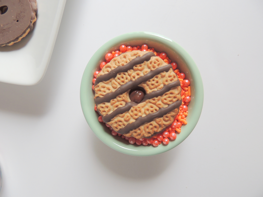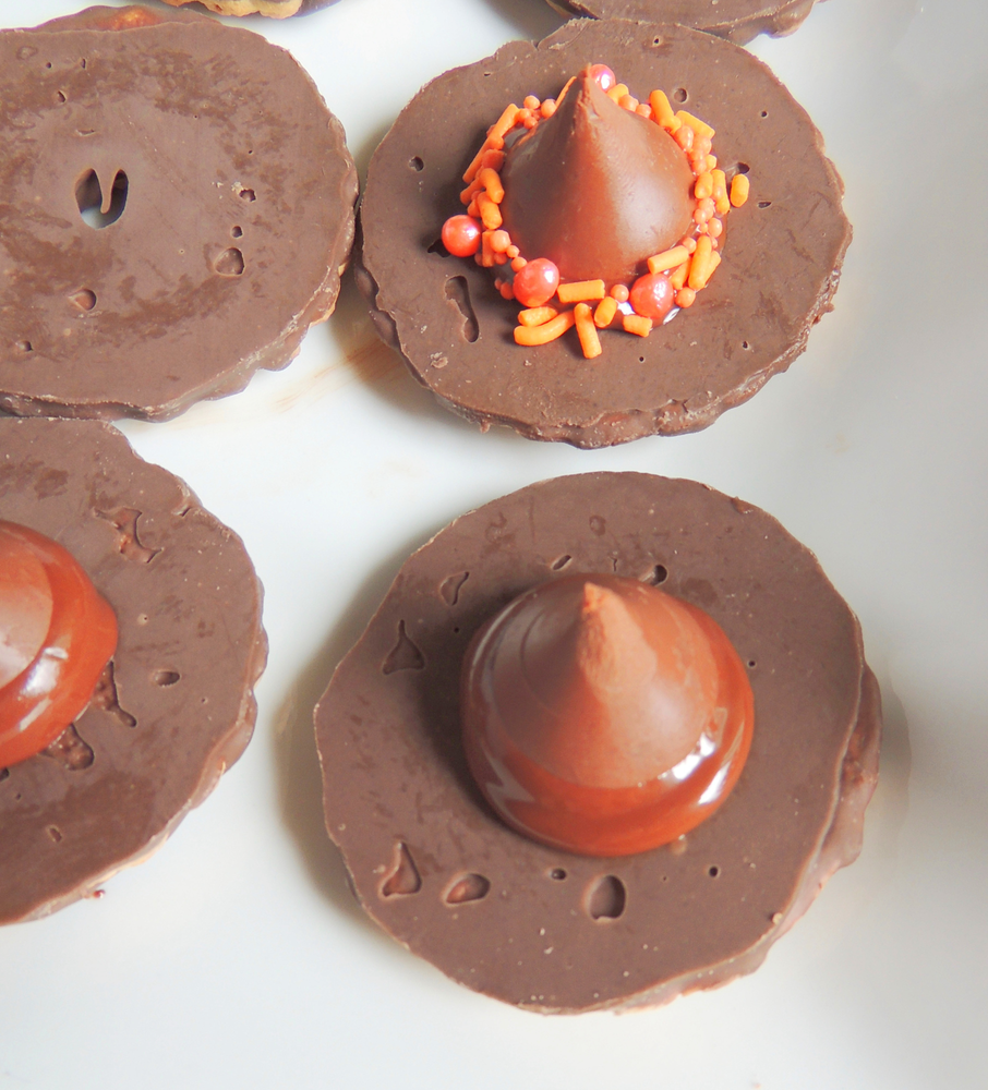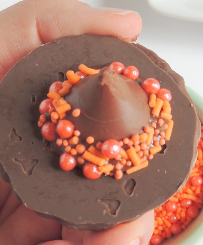 Dip cookie in orange sprinkles to cover melted chocolate