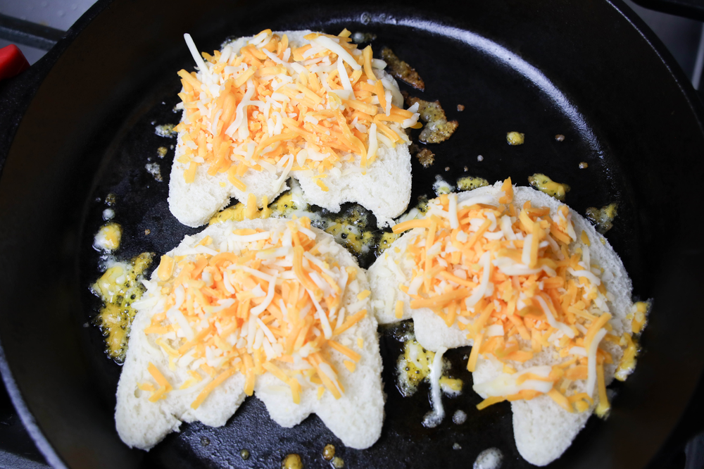 Top the three ghost breads with cheese and then place three more ghost breads over the tops. Wait about 1 minute or until underside is toasted and flip with spatula.