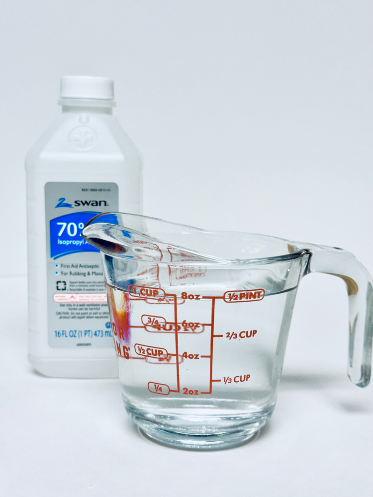 Measure 1 cup of rubbing alcohol into a measuring cup and add to the large container.