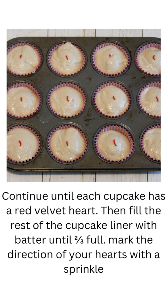 cupcake batter. Continue until each cupcake has a red velvet heart. Then fill the rest of
