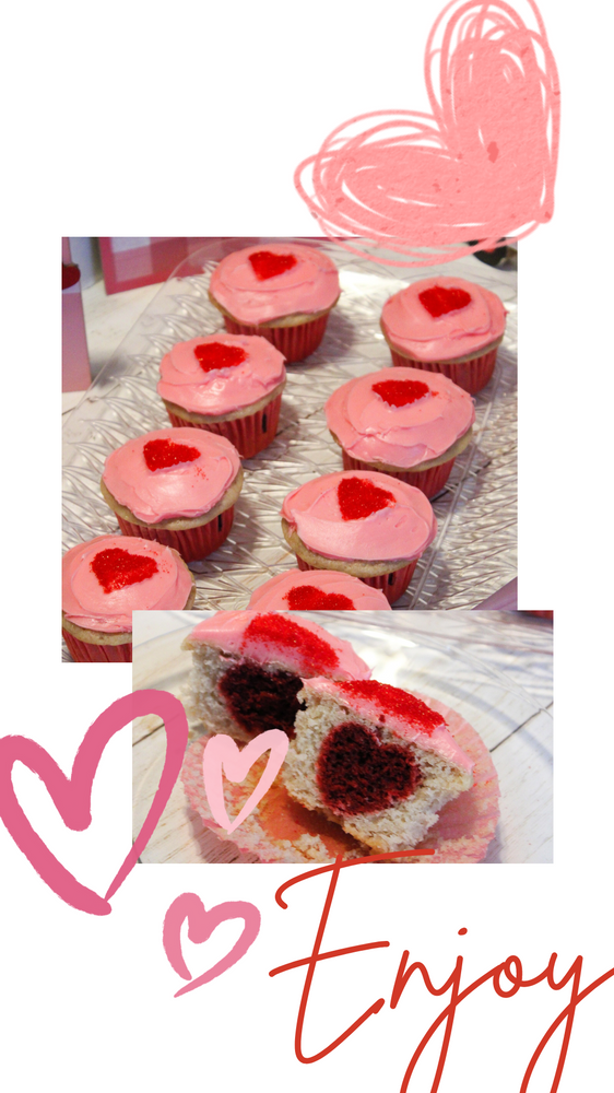 Notes: cupcakes can be red velvet with vanilla heart cutout inside, or any combination you’d