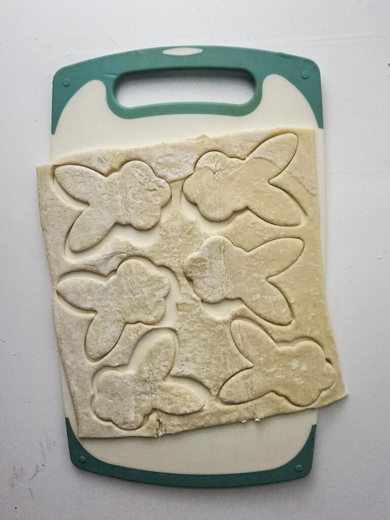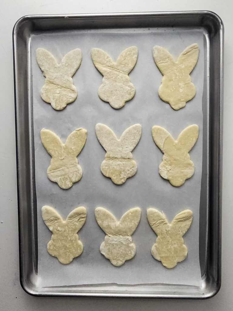 Preheat your oven to 375°F and line a baking sheet with parchment paper. Using a bunny-shaped cookie cutter, cut out as many bunny shapes as possible from the puff pastry sheets. Arrange the bunnies on the prepared baking sheet, leaving space between them.