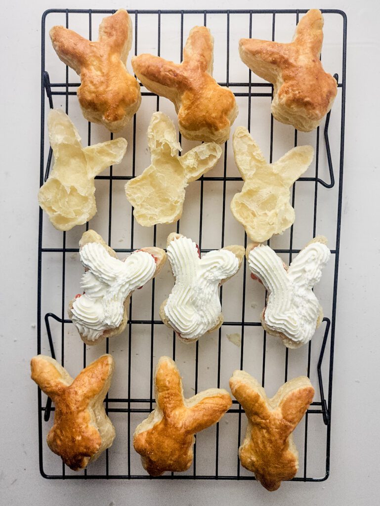 10. Now that the bunny pastries are cooled, slice each in half to create a sandwich.