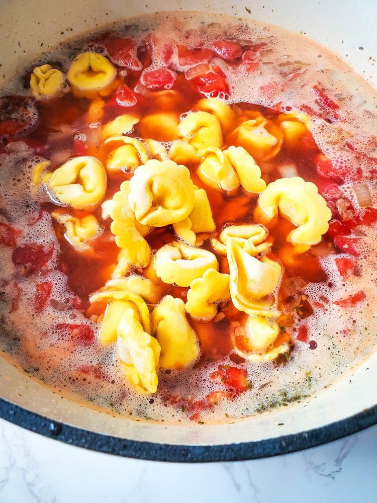 6. Add the tortellini, reduce the heat to low, and simmer for 5 minutes.