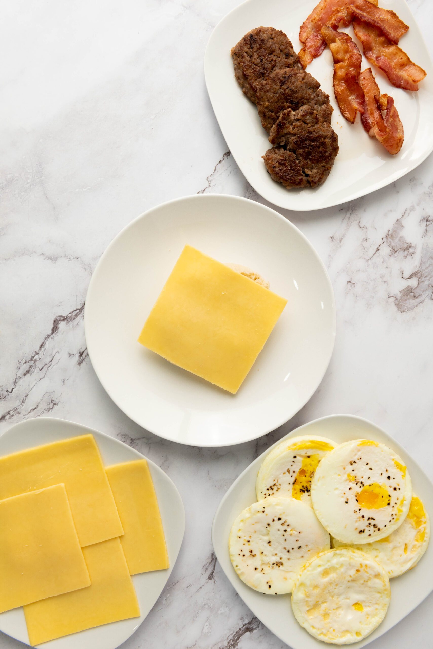 - Assemble the Sandwiches: Place the bottom half of each English muffin on a clean surface. Place a slice of cheese on each muffin half. For the other 3 sandwiches, top with a cooked egg and a sausage patty. Cover with the top half of the English muffin.