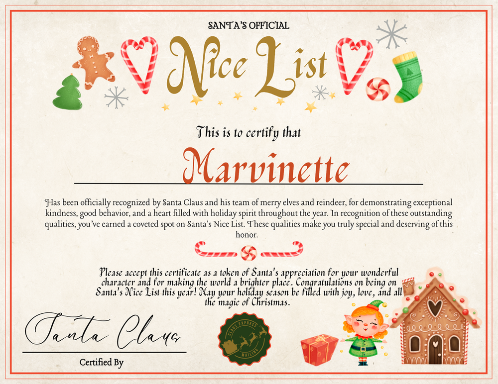 Santa's nice list is a list that Santa Claus keeps to track all the children who have been good throughout the year. It is said that he checks this list twice to determine which children will receive gifts on Christmas Eve. Being on Santa's nice list is every child's dream, as it means they have behaved well and made good choices throughout the year. Using a customizable certificate for Santa's nice list can add an extra special touch to your Christmas traditions. Not only does it make the experience more personalized and memorable, but can get a child excited for the upcoming Christmas festivities.