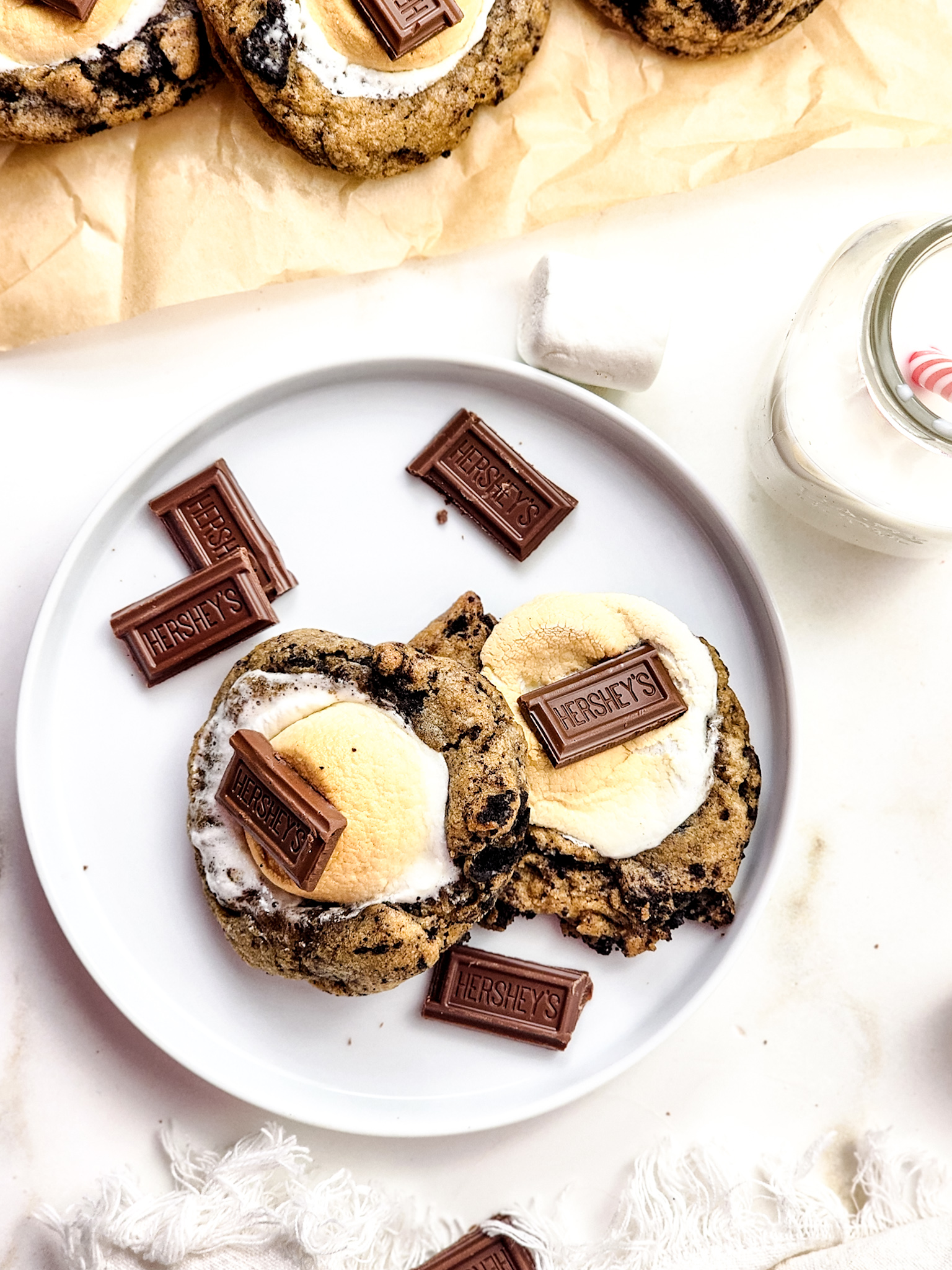 These cookies are best enjoyed warm, allowing the marshmallow and chocolate to be gooey and melty. Serve them on their own as a dessert or pair with a glass of milk or hot chocolate for a nostalgic treat. For an extra decadent option, sandwich two cookies with a scoop of vanilla ice cream in between—perfect for s’mores lovers!