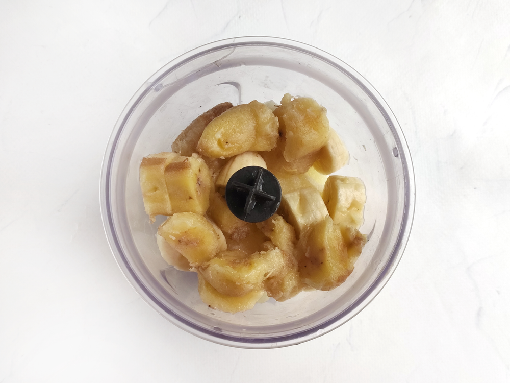 1. The day before cooking, freeze the bananas in their peels. Peel bananas and slice randomly. Place bananas in the bowl of a blender. Add the peanut butter and milk.