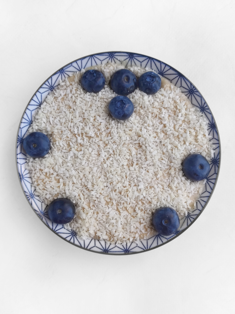 3. Sprinkle coconut shavings over the surface of the smoothie. Arrange the blueberries around the perimeter of the bowls.