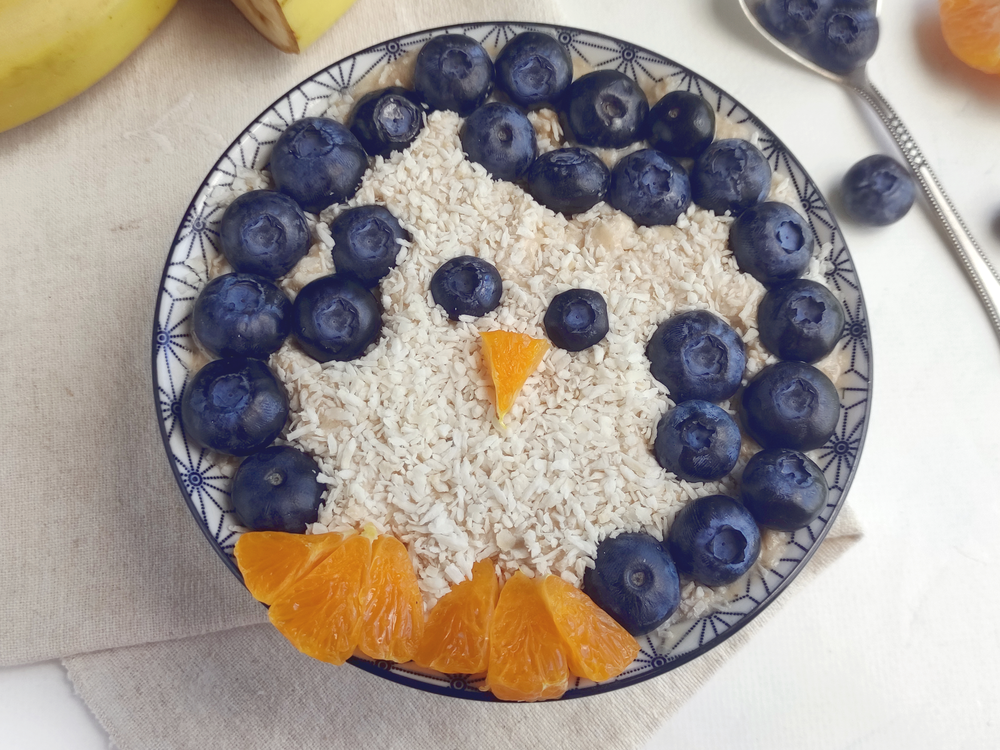 To make the smoothie special, we served it in a bowl and decorated it in the shape of a cute penguin. The decoration will require any dark berries – blackberries, mulberries or blueberries of your choice. The legs and beak are cut out of tangerine slices. The decoration will add an element of fun and creativity to your meal, making healthy eating more enjoyable.