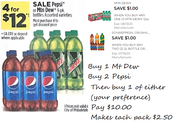 Pepsi & Mountain Dew $2.50 per six pack