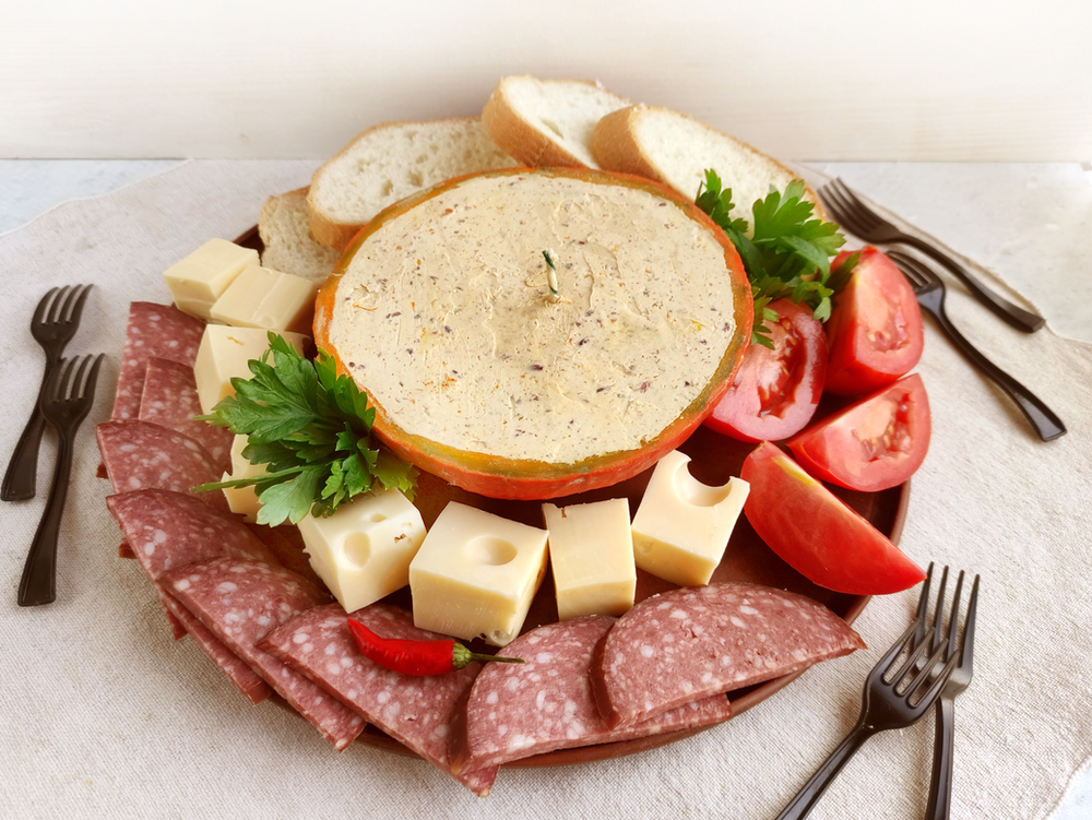 5. Cut the room temperature butter into random pieces and place in the blender. Add the salt and beat the butter until smooth. Blot off excess juice from the pumpkin coulis. Transfer the butter to the bowls. Chill for 20 minutes in the refrigerator. Brush the cotton wick with butter and freeze. Make a hole in the center with a skewer and insert the wick. Freeze the bowls with pumpkin butter. To serve, place a buttered candle in the center of a serving plate. Arrange fresh artisan bread, tomato slices, aged cheese and salami slices around the candle. Enjoy!