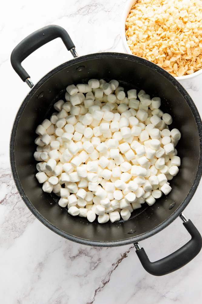 · Remove the pot from heat and immediately mix in the Rice Krispies cereal until well coated.