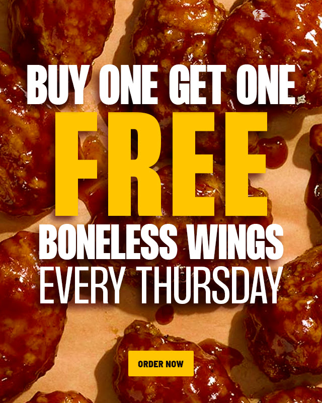 Are you looking for a delicious deal to kick off your weekend? Look no further than Particip. locs.! Every Thursday in March, when you buy one six piece boneless wings, you'll get another one of equal value completely free. But remember, this offer is not valid with any other discounts or offers, so don't miss out on this exclusive deal. Hurry in and take advantage of this mouthwatering promotion before it's too late!
