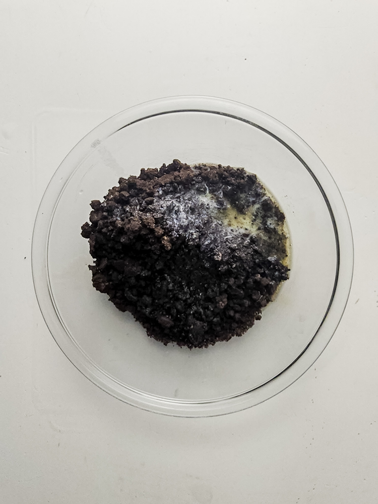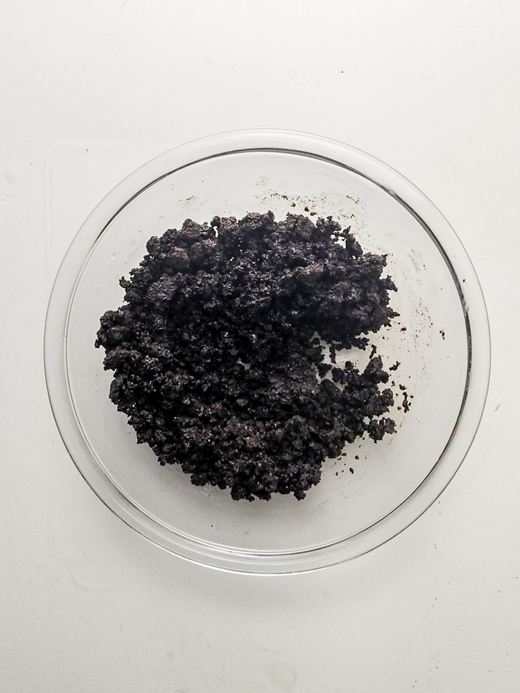 In a small mixing bowl, add the crushed oreos and melted butter. Mix with a spoon until all the oreo pieces are coated.