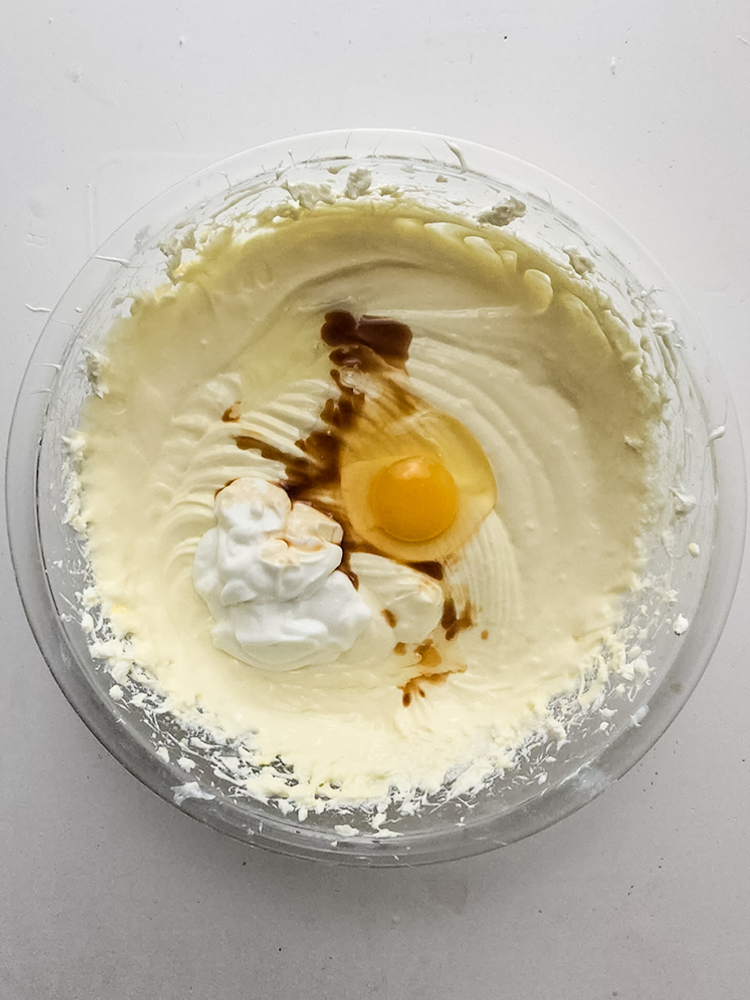 Add the eggs one at a time, blending in between each addition. On the addition of the last egg, also pour in the sour cream and vanilla extract. Blend on medium high speed until completely smooth and creamy.