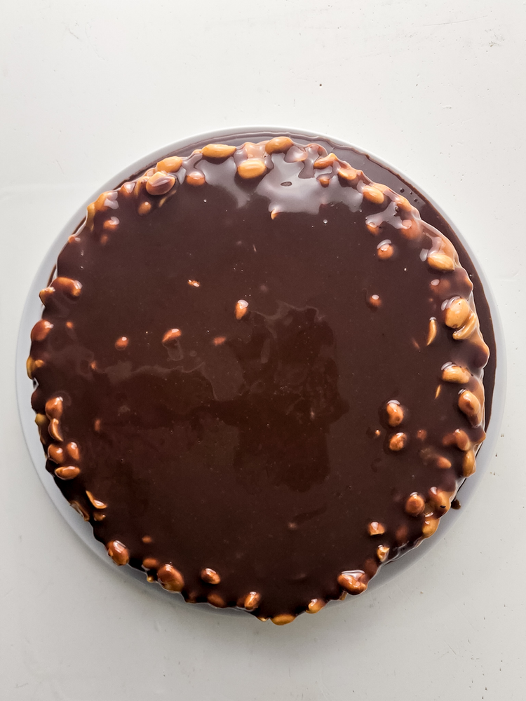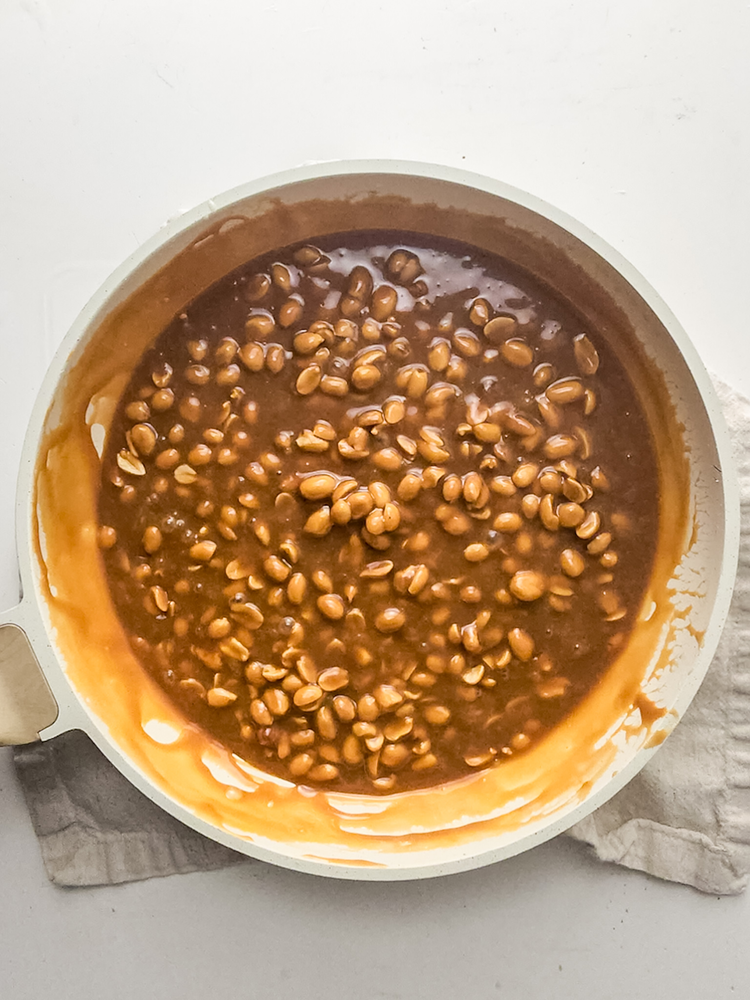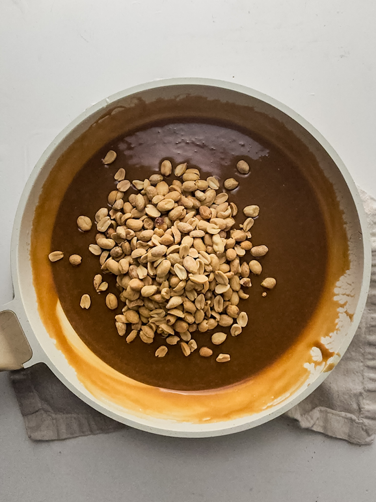 Remove from the heat and stir in the peanuts. Pour this caramel layer on top of the cheesecake. Let cool in the refrigerator for about 15 minutes until the caramel doesn’t stick to your finger.