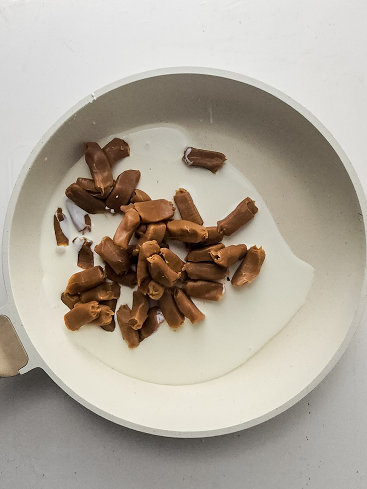 In a saucepan, melt the caramel candies and heavy cream together on medium heat. Let the two melt together, stirring continuously until smooth and creamy.