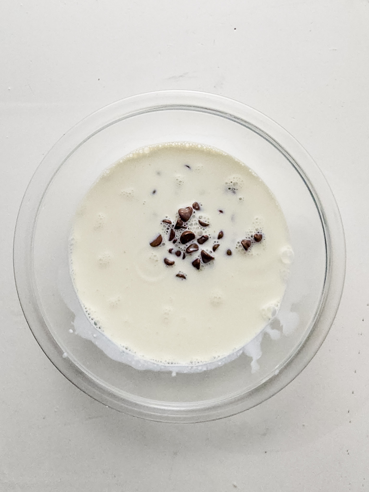 Pour on top of the milk chocolate chips in a bowl and add the salt. Let sit for 2 minutes before stirring together to create a smooth, shiny ganache.