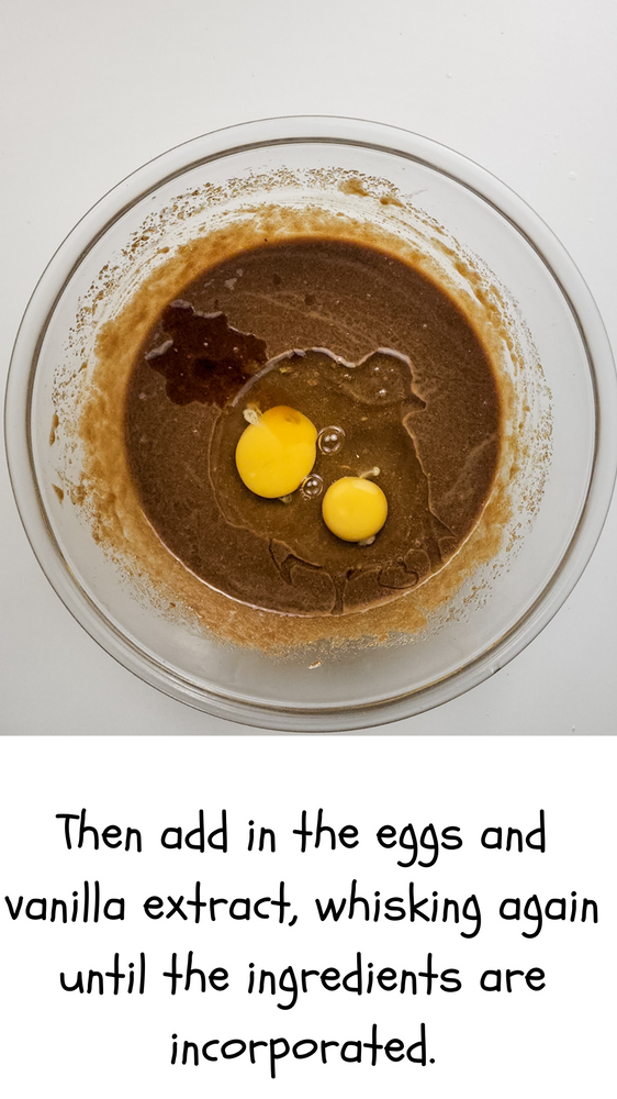 Then add in the eggs and vanilla extract, whisking again until the ingredients are incorporated.