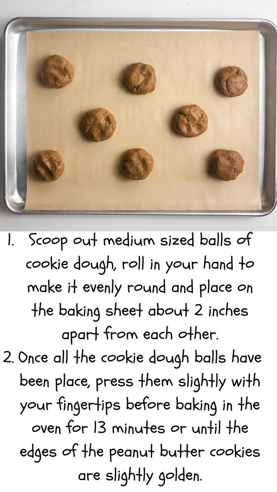 Once all the cookie dough balls have been place, press them slightly with your fingertips before baking in the oven for 13 minutes or until the edges of the peanut butter cookies are slightly golden.