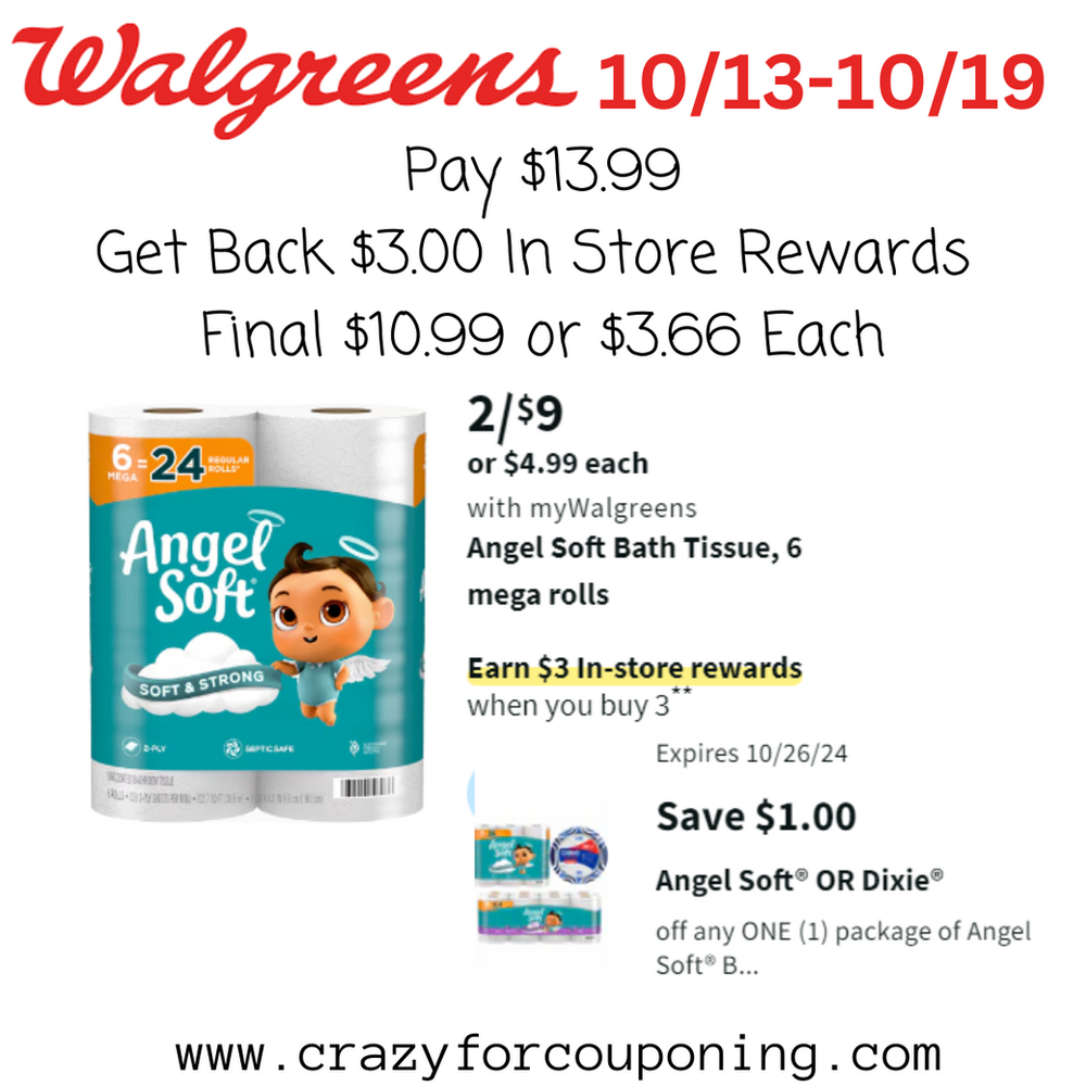 From 10/13 – 10/19, Angel Soft 4 Mega Rolls are on sale for 2/$9.00 or $4.99 Each. Even better, there’s a promotion where you’ll earn $3 in-store rewards when you purchase three packs. Stack this with a $1.00 off digital coupon on the Walgreens app, and you’ll see your out-of-pocket cost drop even more!