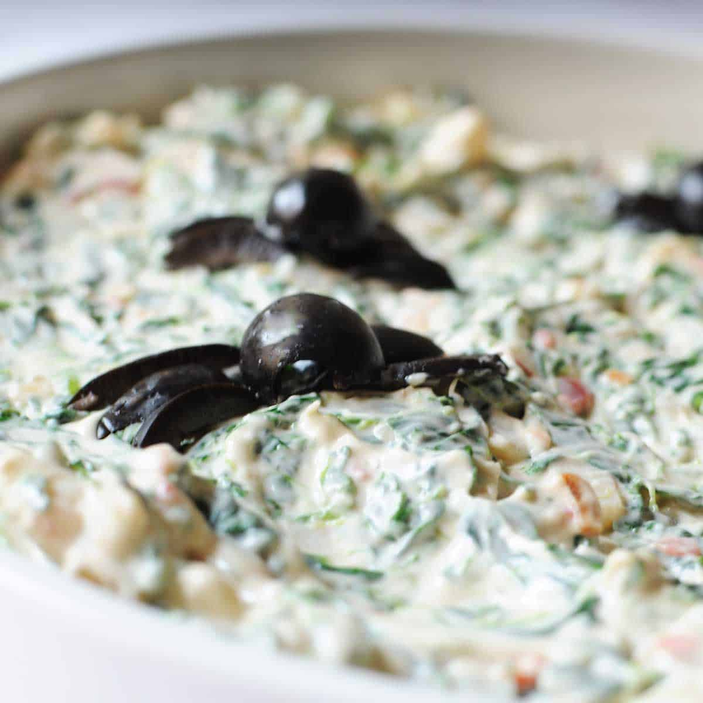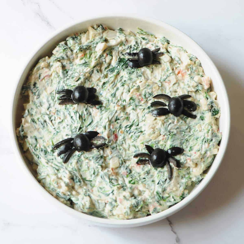 This Halloween spinach dip is sure to be your new go-to for parties. It tastes great and the olive spiders make it extra spooky!