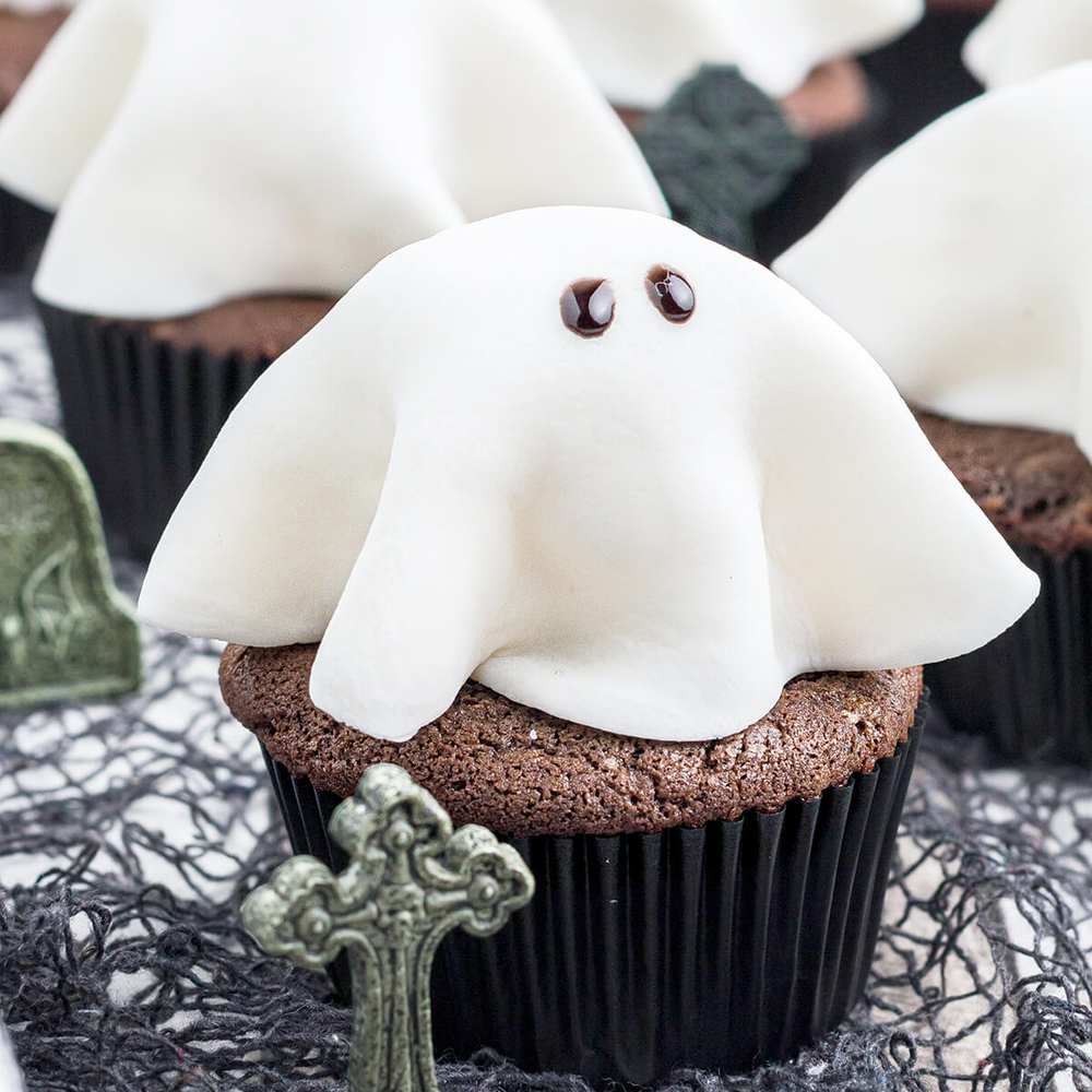 Use this simple chocolate cupcake recipe and purchased fondant to make these adorable Halloween Ghost Cupcakes to serve to all your trick-or-treaters. Let the kids join in the fun helping you make these cute and spooky, ghostly delights!