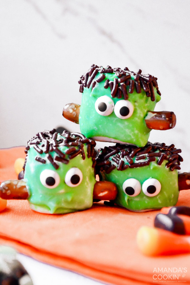 Marshmallow Frankensteins; If you’re looking for easy-to-make, no-bake Halloween treats, these marshmallow Frankensteins are the perfect fit. These adorable chocolate dipped monsters are so much fun to make for Halloween parties.