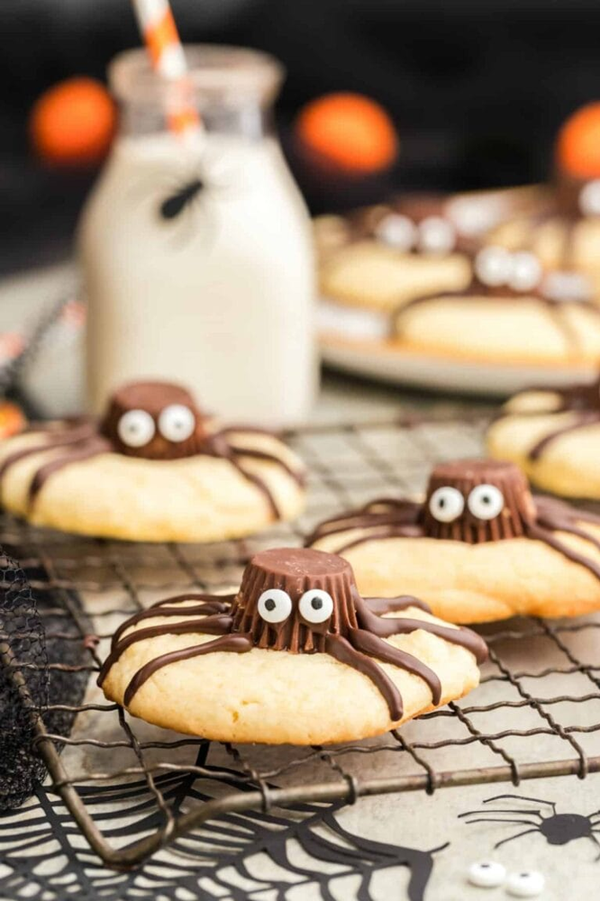 Halloween Spider Cookies are the easiest and cutest Halloween dessert ever! All you need is your favorite cookie, Reese's Peanut Butter Cups, candy eyes and some chocolate drizzle!