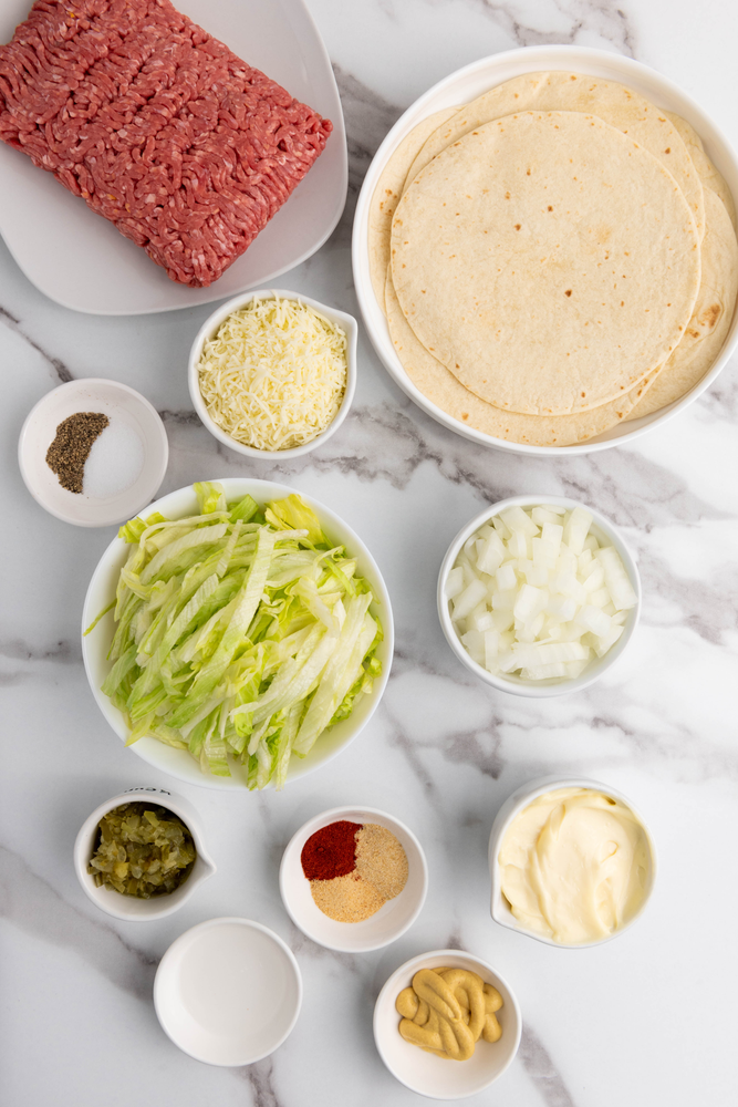 · To assemble each taco, place a generous amount of shredded iceberg lettuce with onions on top of the burger.