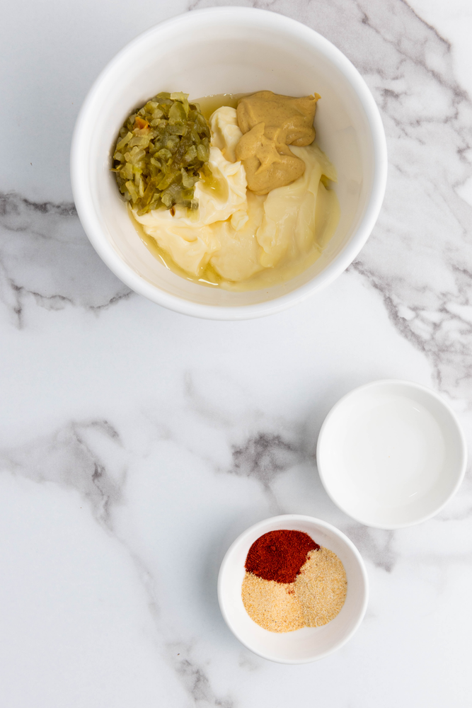 · Prepare the Sauce: In a small mixing bowl, combine the mayonnaise, dill pickle relish, Dijon mustard, white vinegar, paprika powder, onion powder, and garlic powder. Mix well until all the ingredients are fully blended. Set the sauce aside.