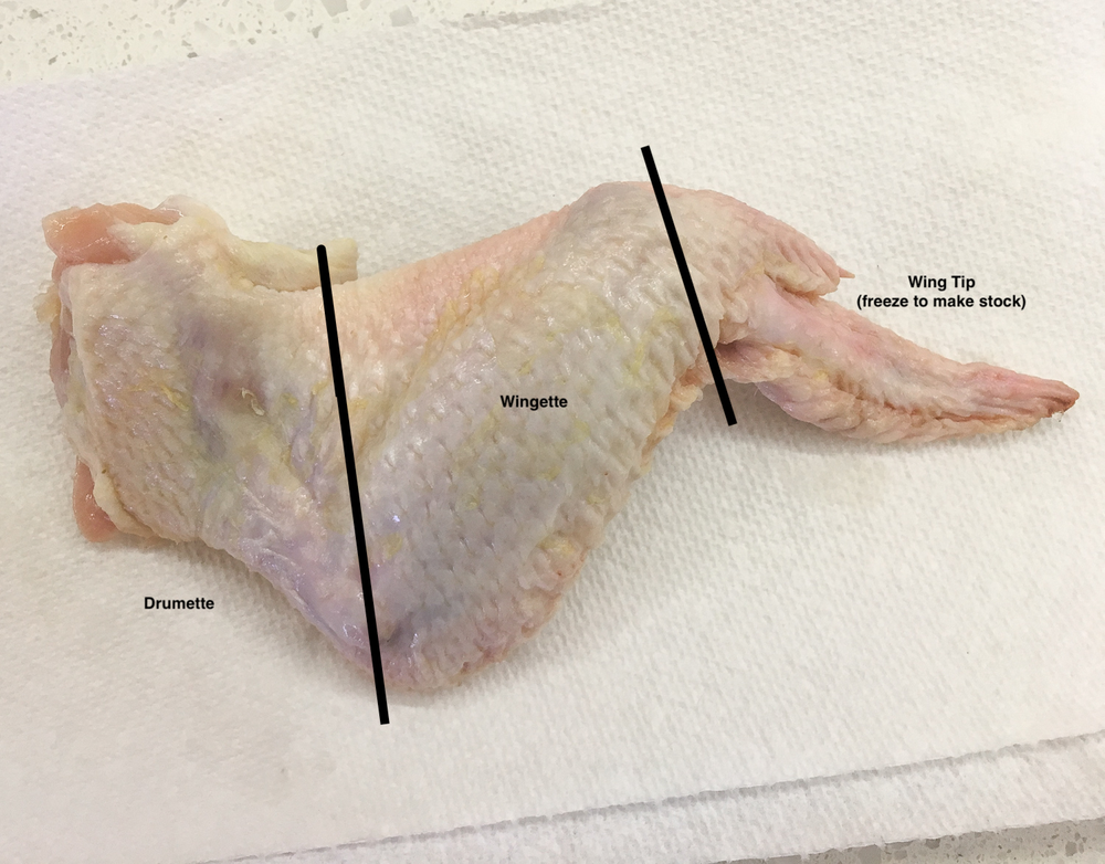 Tip: You can save money by trimming your wings yourself. (See photo for approximate location of where to cut each whole wing). They are a little easier to trim AFTER they’ve been cooked. Immediately freeze the tips to make chicken stock, if desired. Note: This recipe is written for fresh or thawed wings. If using frozen wings, add 3-4 minutes to the active cook time.