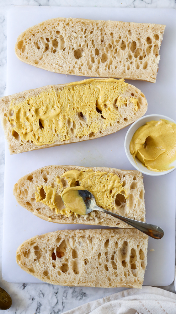 1. Cut the Cuban bread in half lengthwise and spread mustard on both sides.