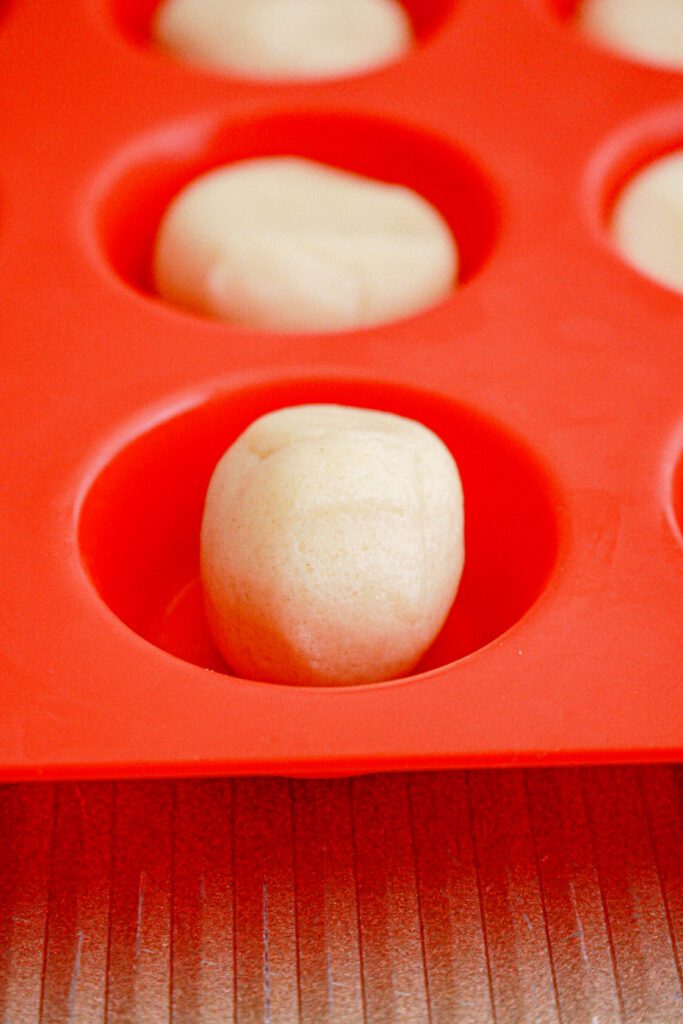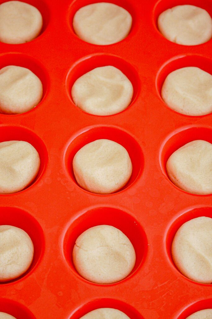 - Roll the dough into balls (about 2 teaspoons in size) and place in the muffin cups and gently flatten.